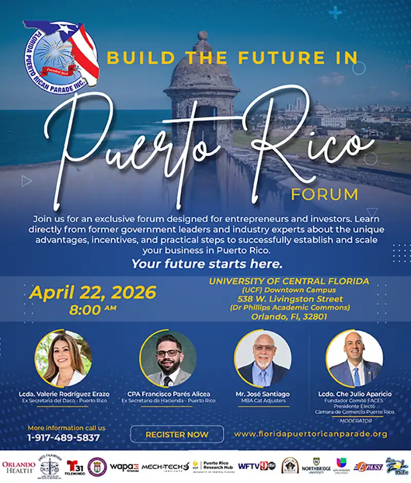 Purpose: In addition to the cultural celebration, the 2026 events will serve as a strategic platform to highlight the island’s economic opportunities and inspire young talent and entrepreneurs to invest in Puerto Rico’s future. We want to showcase Puerto Rico as a vibrant, viable hub for innovation, entrepreneurship, and sustainable growth, and look forward to attracting professionals, entrepreneurs, and developers to invest or return to the island. We encourage Business Representatives, members of Chambers of Commerce, Diaspora Entrepreneurs, and business owners to register and explore the opportunities available to you when expanding or relocating your business to Puerto Rico.
